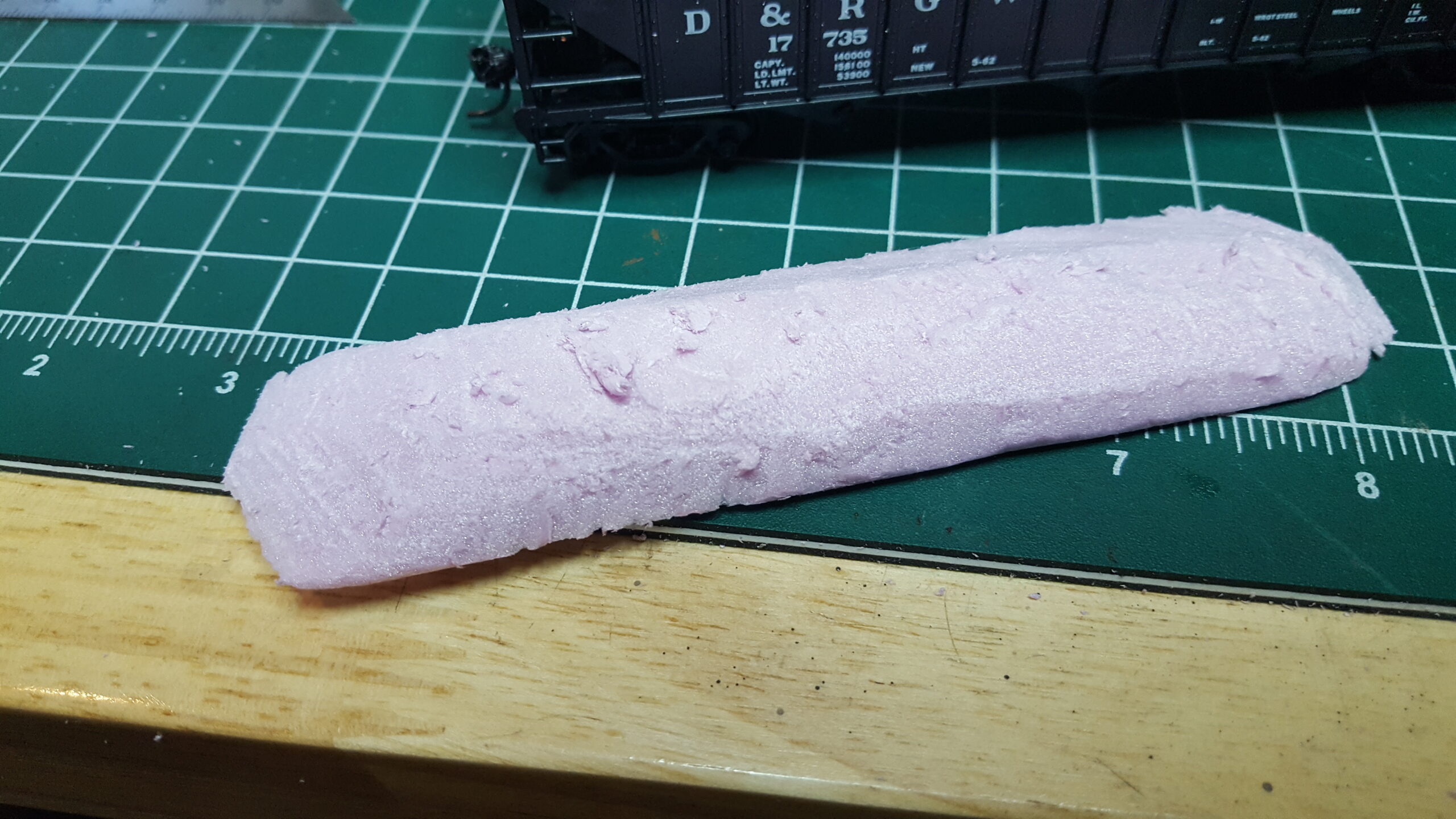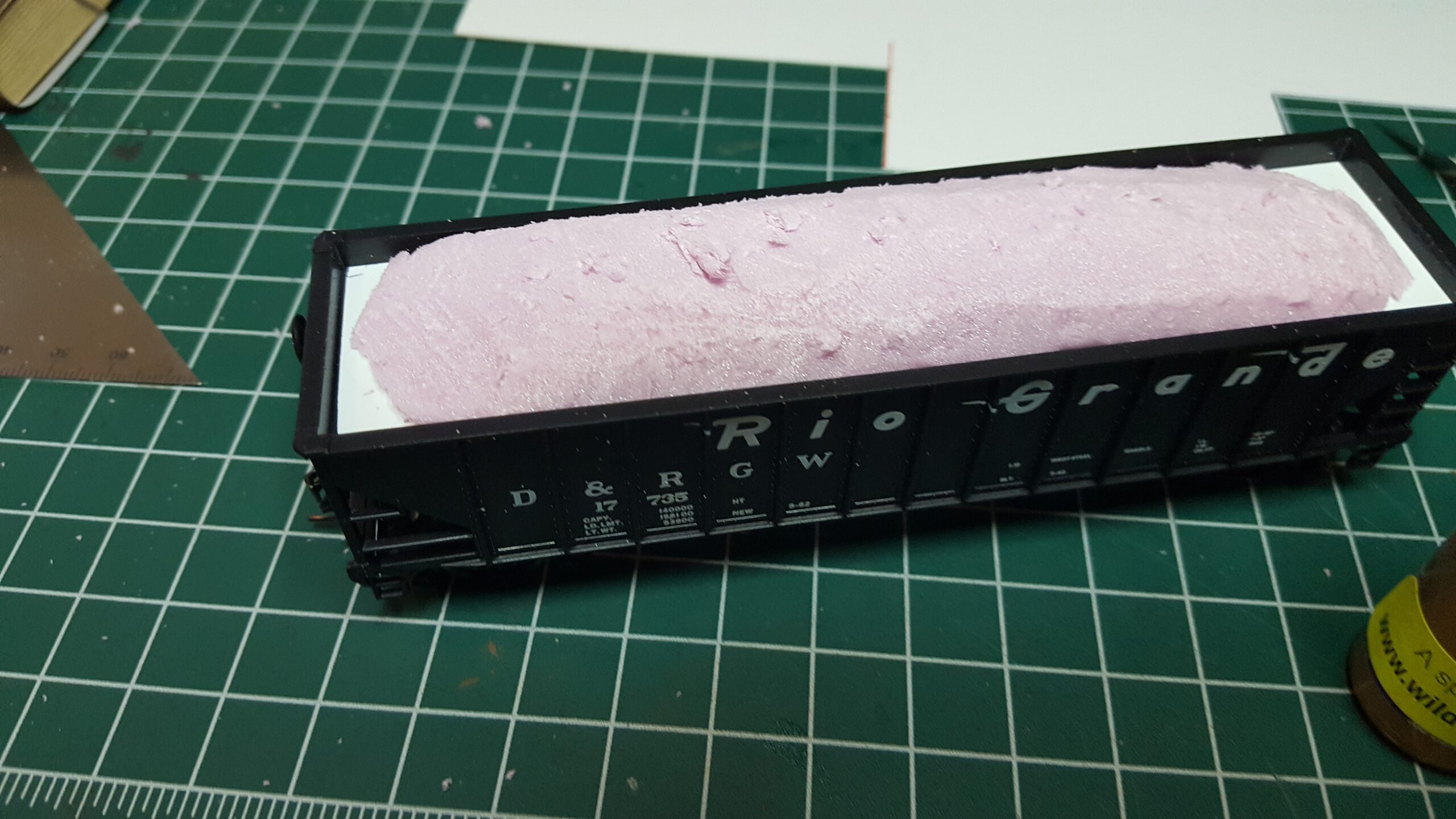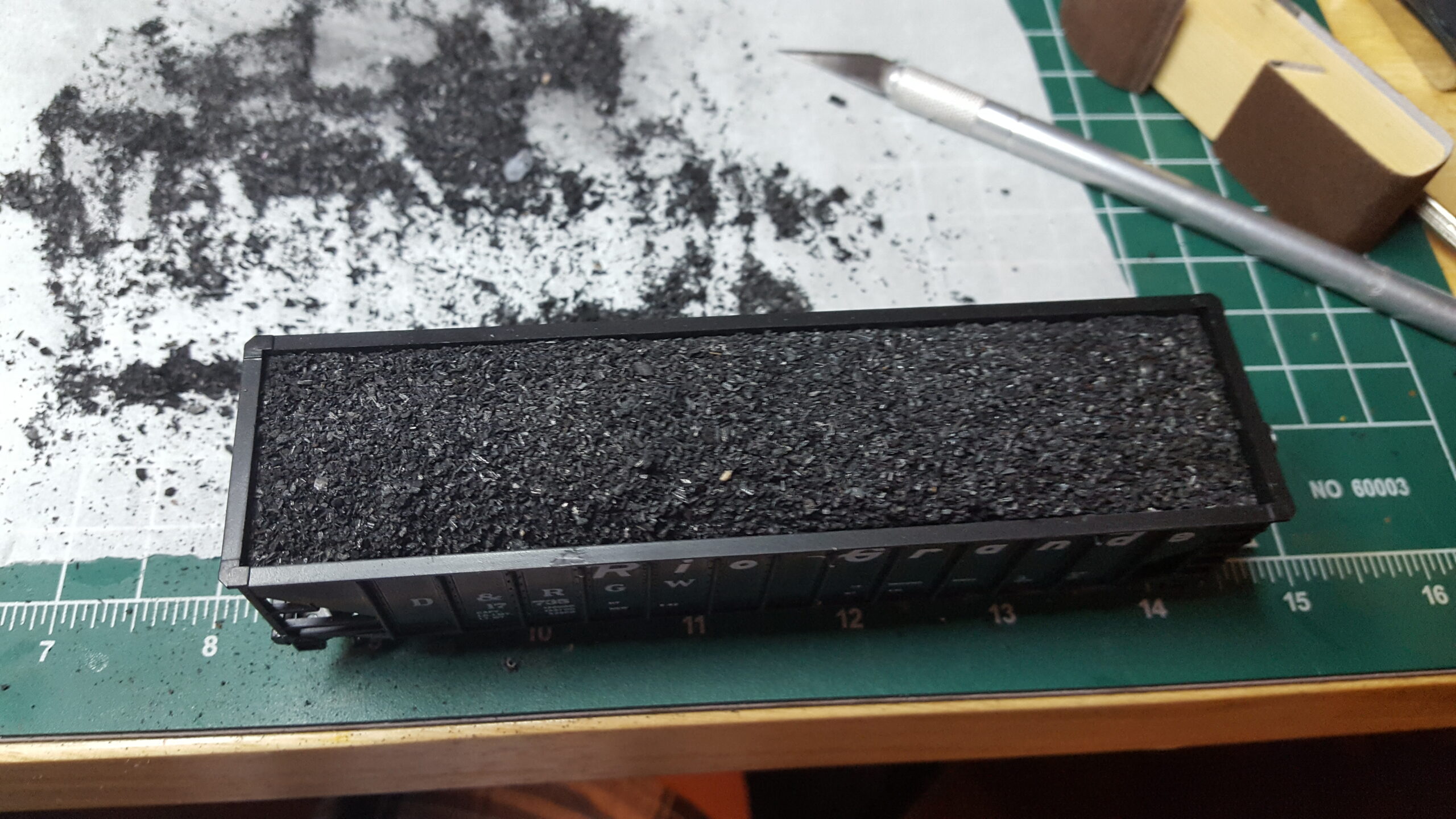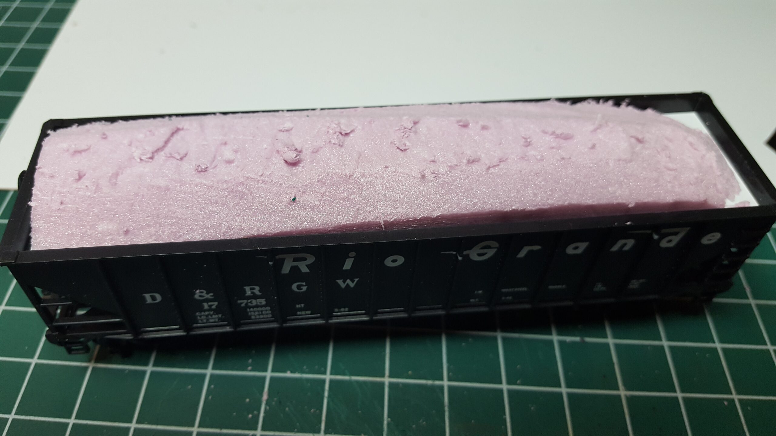 Looking at different approaches to modeling coal loads, I used sheet styrene and foam. Unlike the foam in the ballast car, I used pink insulation foam (most modelers are familiar with this stuff). I like how it turned out.
