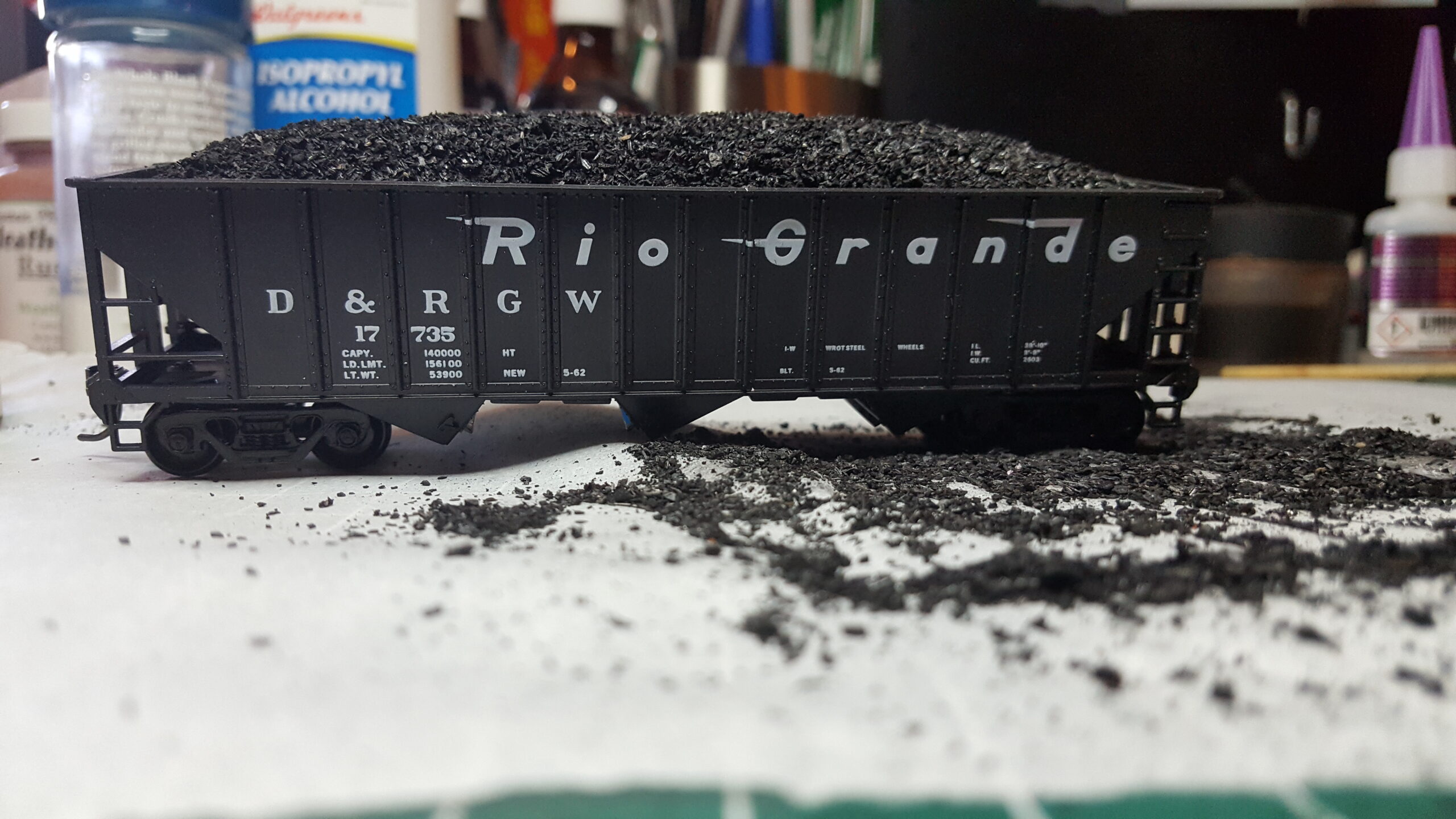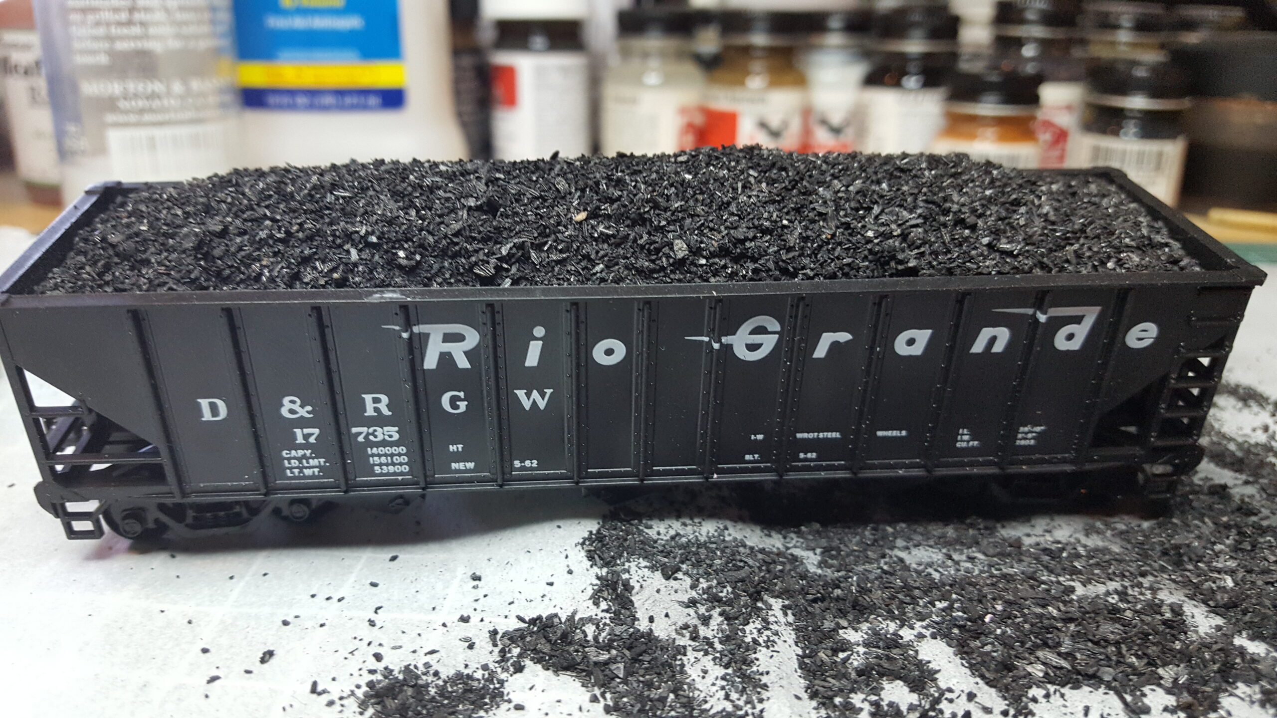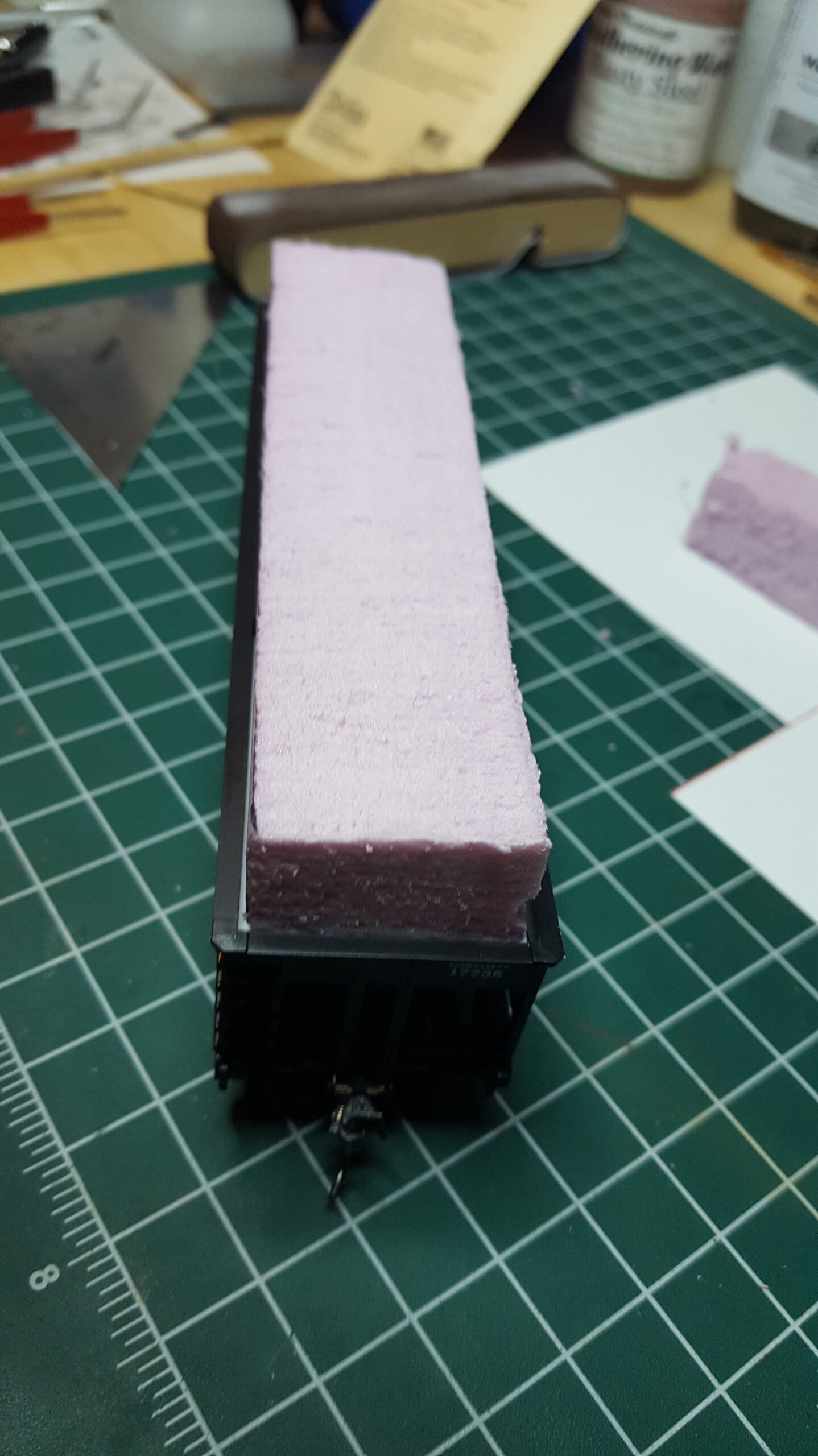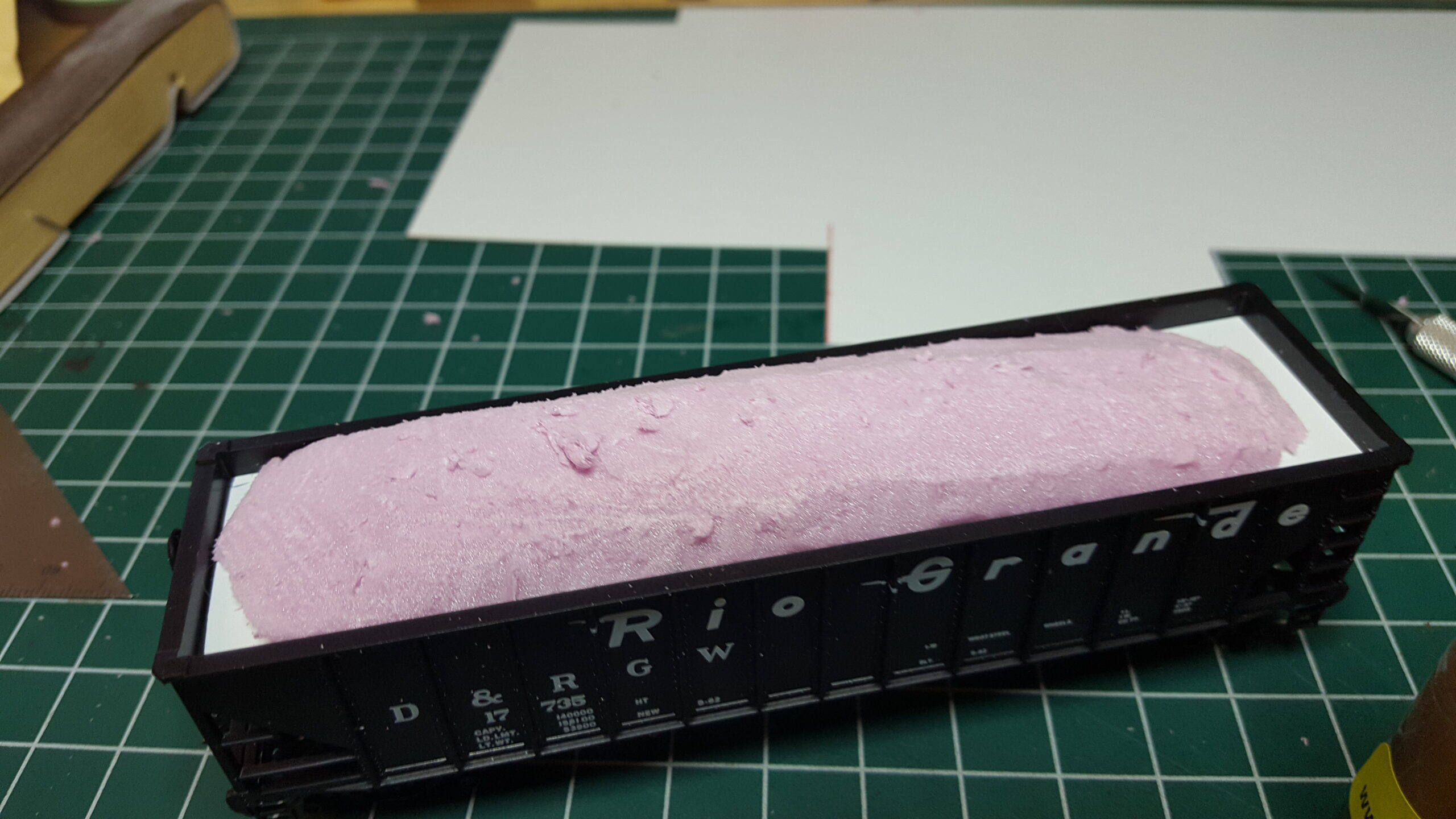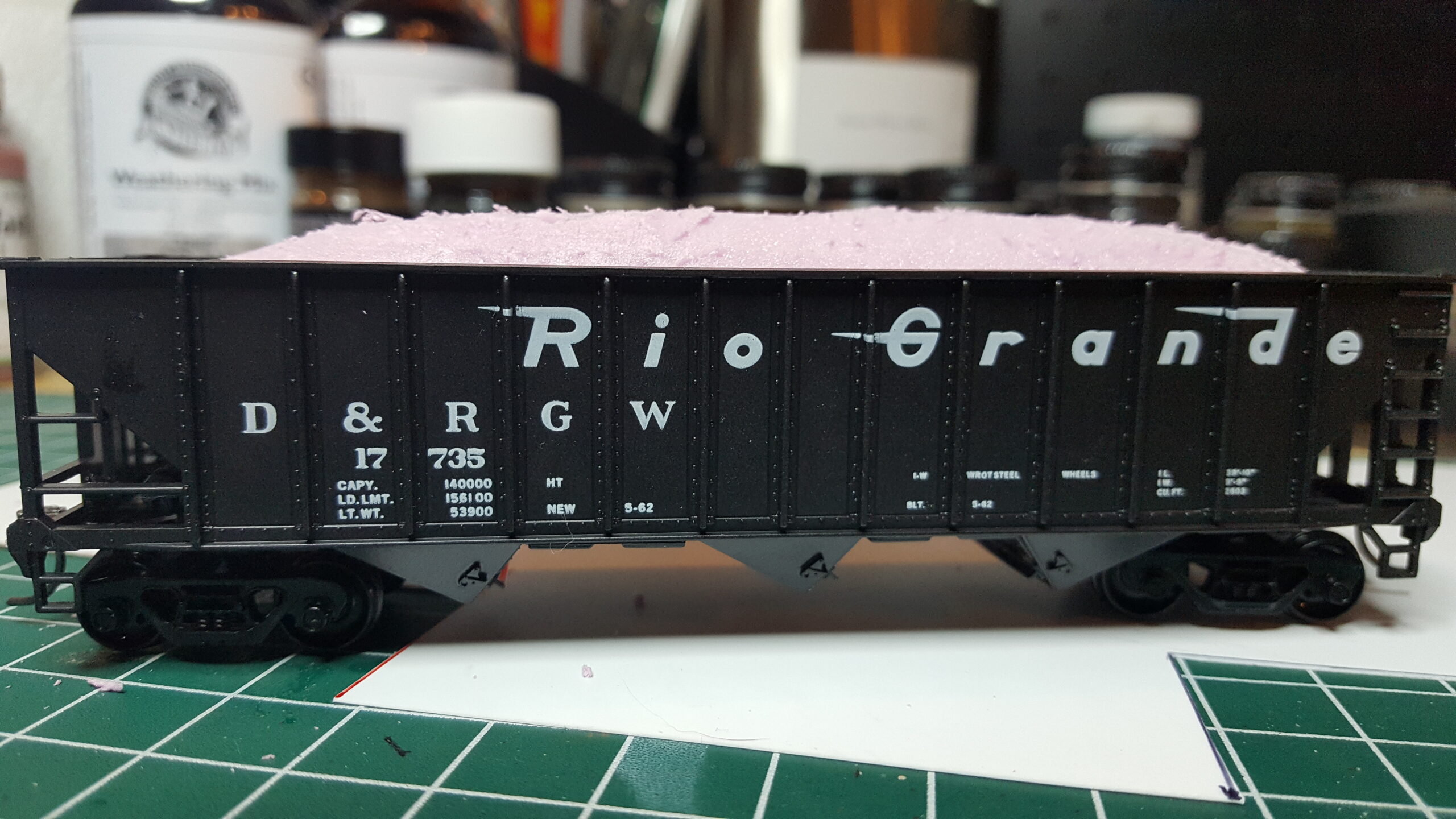 Looking at different approaches to modeling coal loads, I used sheet styrene and foam. Unlike the foam in the ballast car, I used pink insulation foam (most modelers are familiar with this stuff). I like how it turned out.