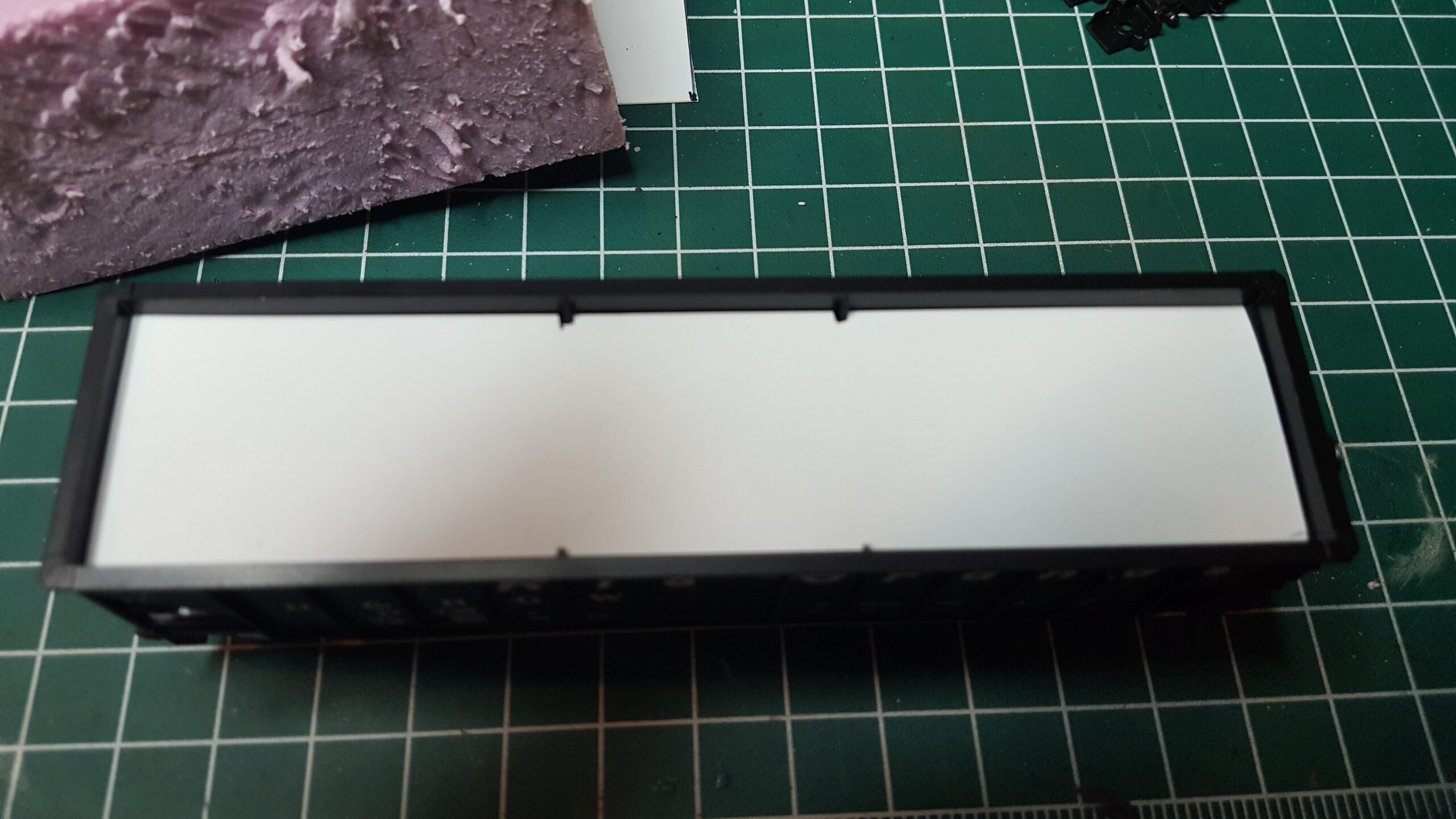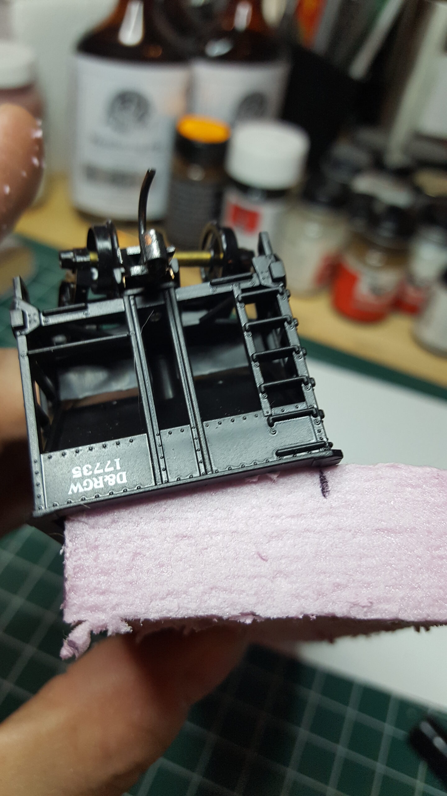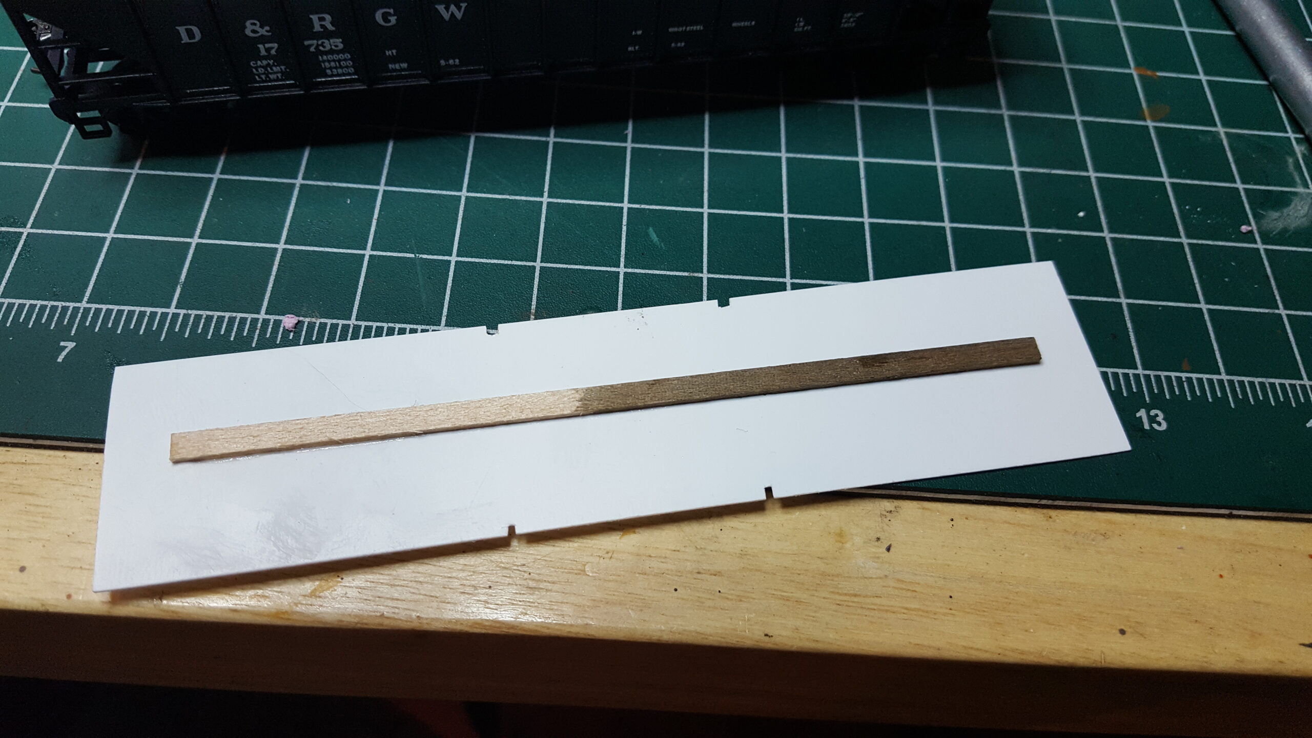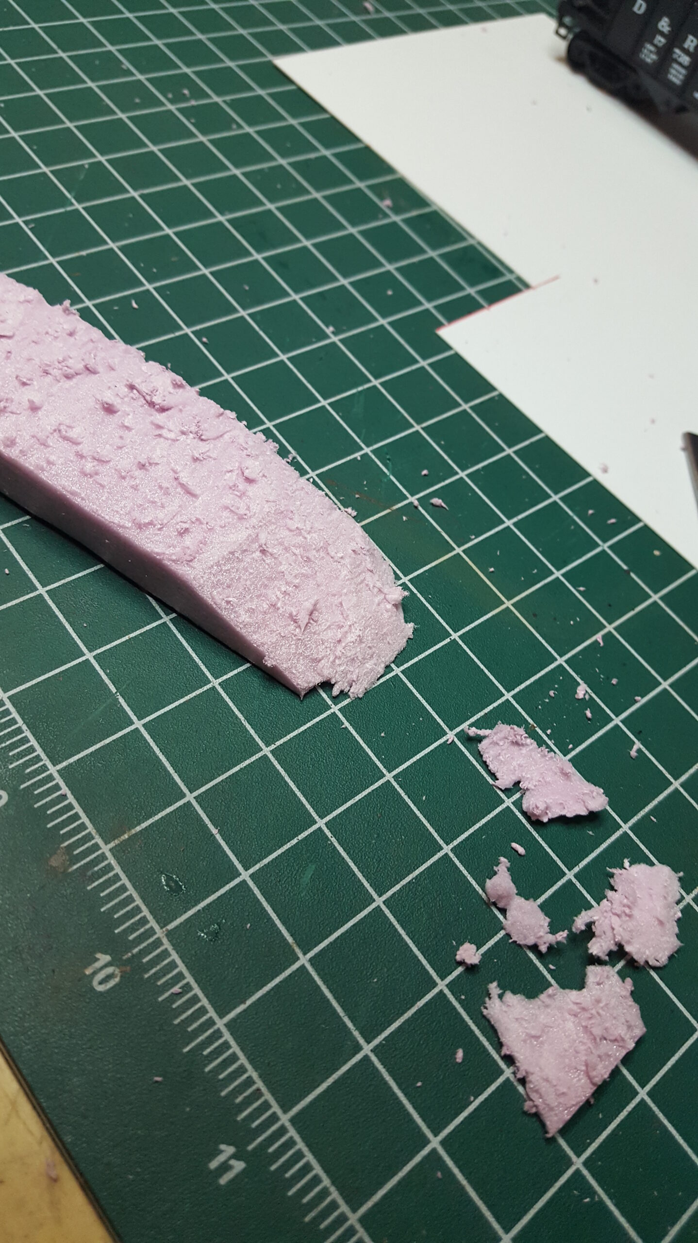 Looking at different approaches to modeling coal loads, I used sheet styrene and foam. Unlike the foam in the ballast car, I used pink insulation foam (most modelers are familiar with this stuff). I like how it turned out.