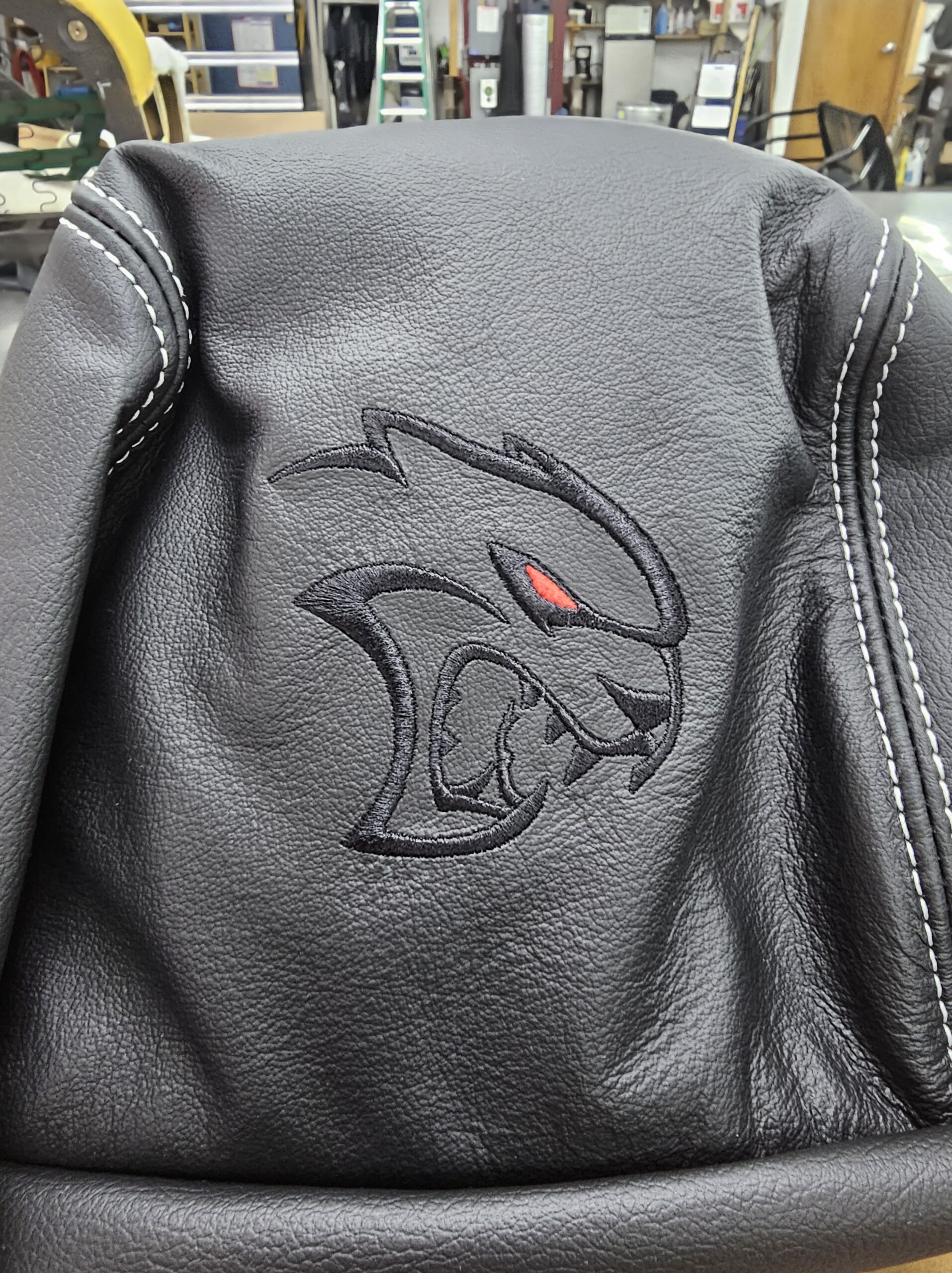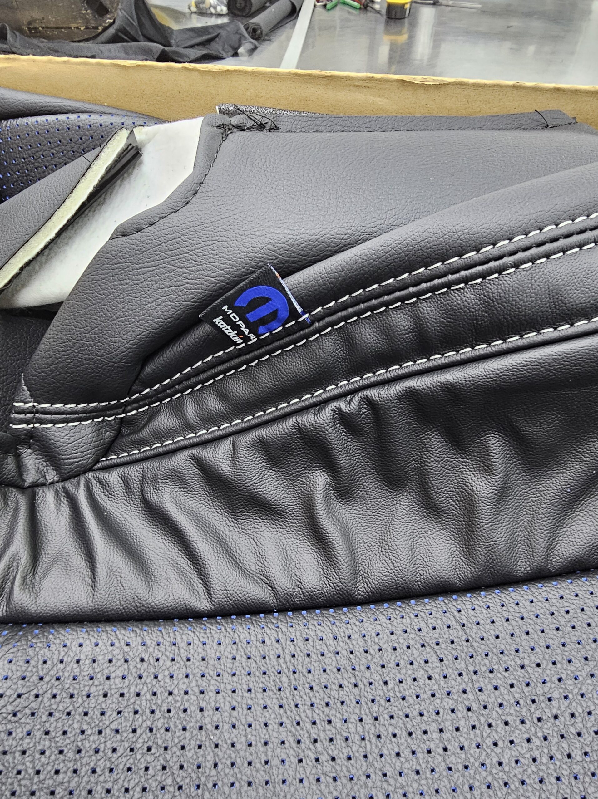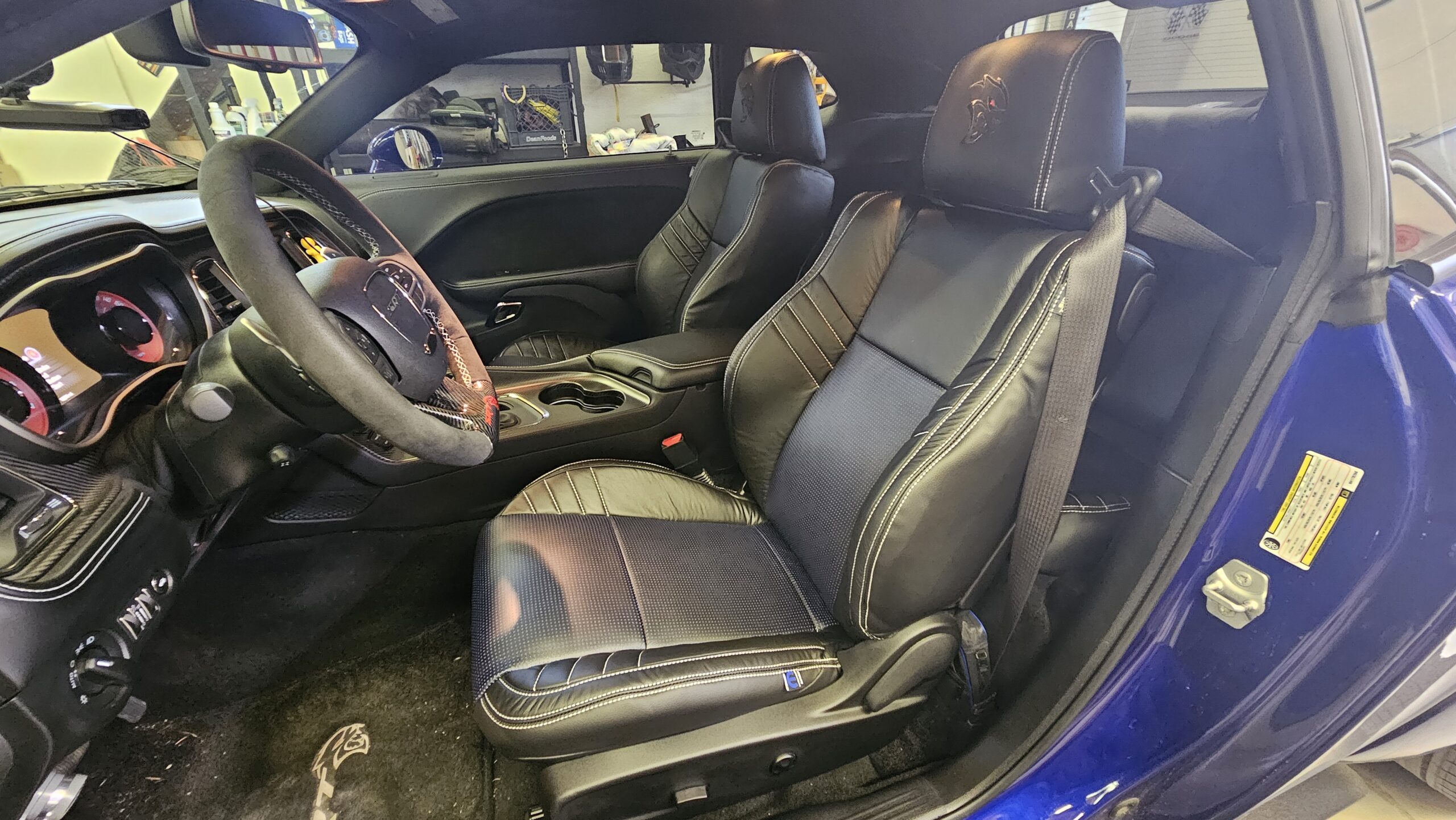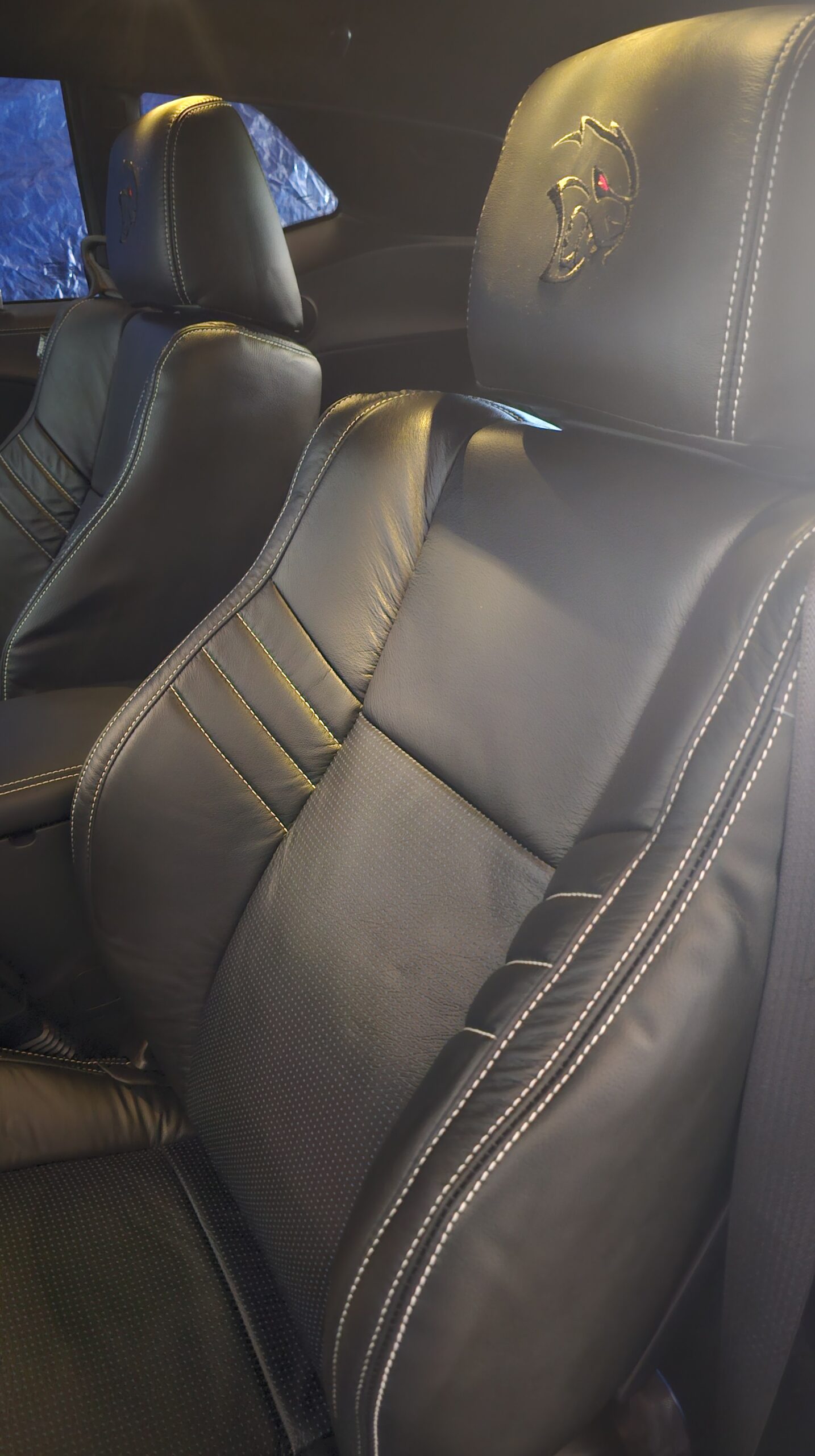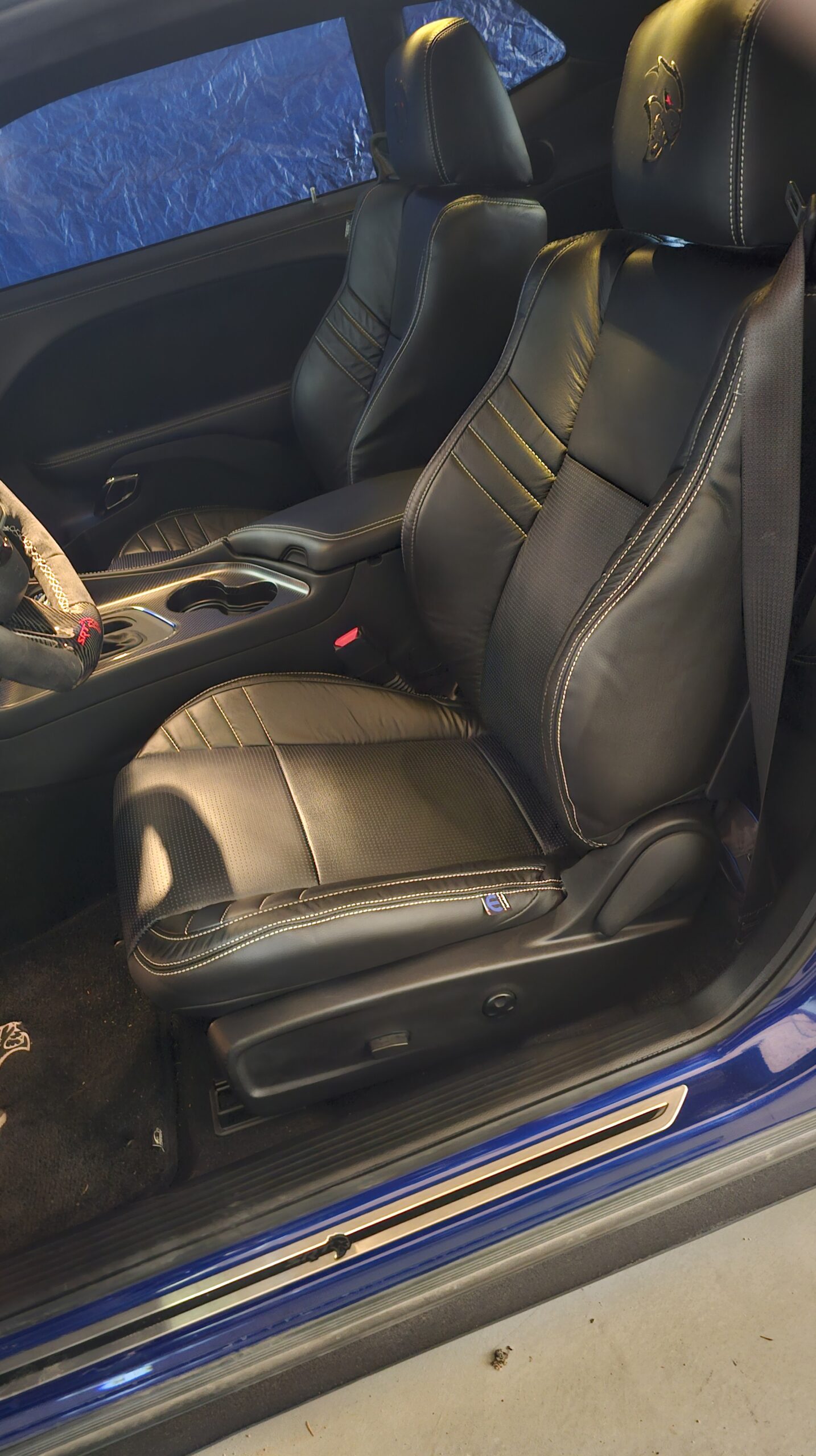 With the “death” of the stock leather bolsters, I worked with Pete at Blue Ribbon Auto, who in turn worked with Katzkin and Dodge to get new interior. Took awhile as Katzkin hadn’t released the Hellcat patterns for the Challenger, only the Charger, until recently. It’s hard to see, but the blue perforation is in the leather holes. It’s a really cool detail that I wasn’t expecting – I was expecting the whole insert to be blue. I much happier with this look; much more subtle. Pete had to go to Dodge for permission to add the Hellcat logo to the headrests.