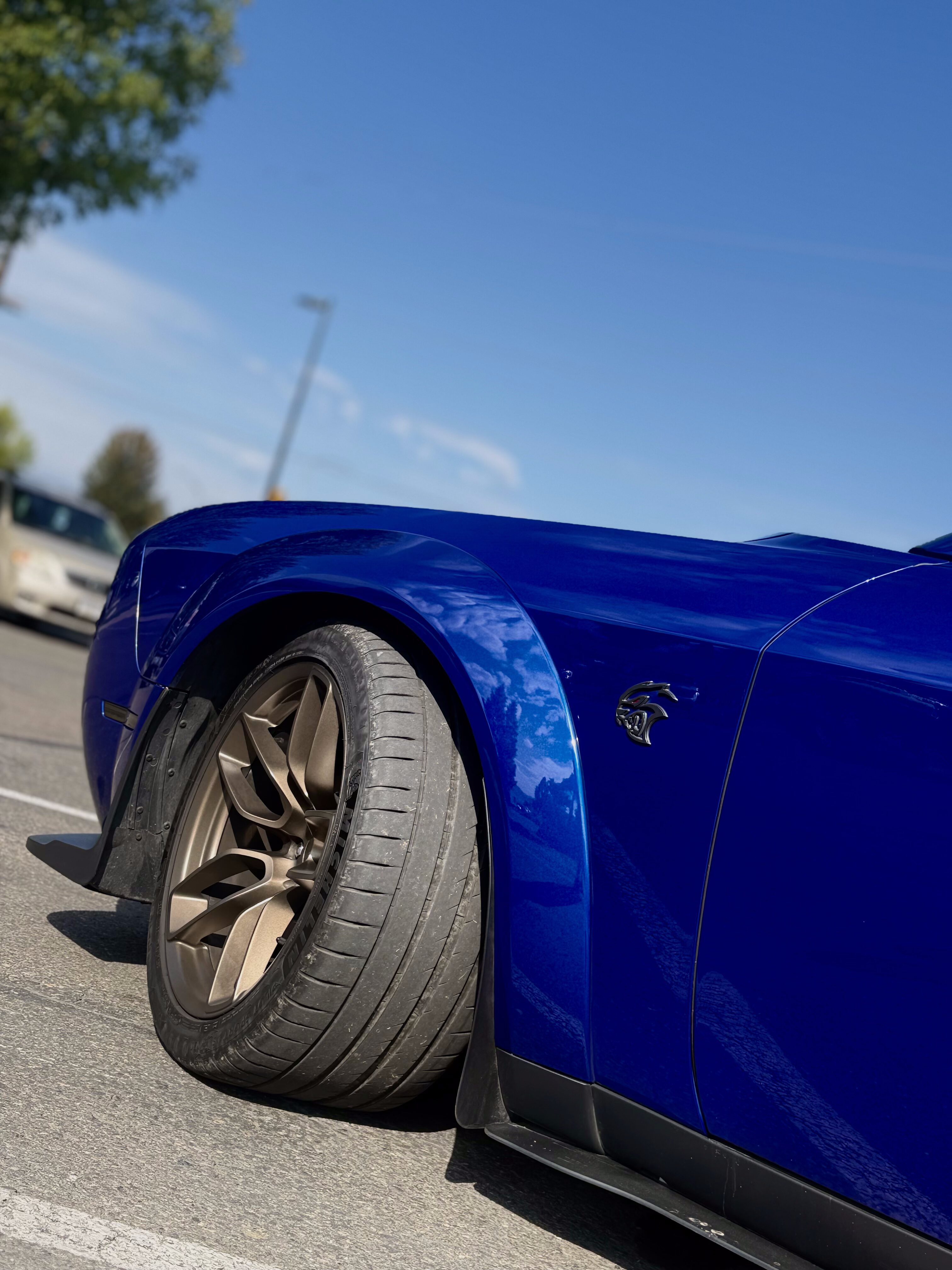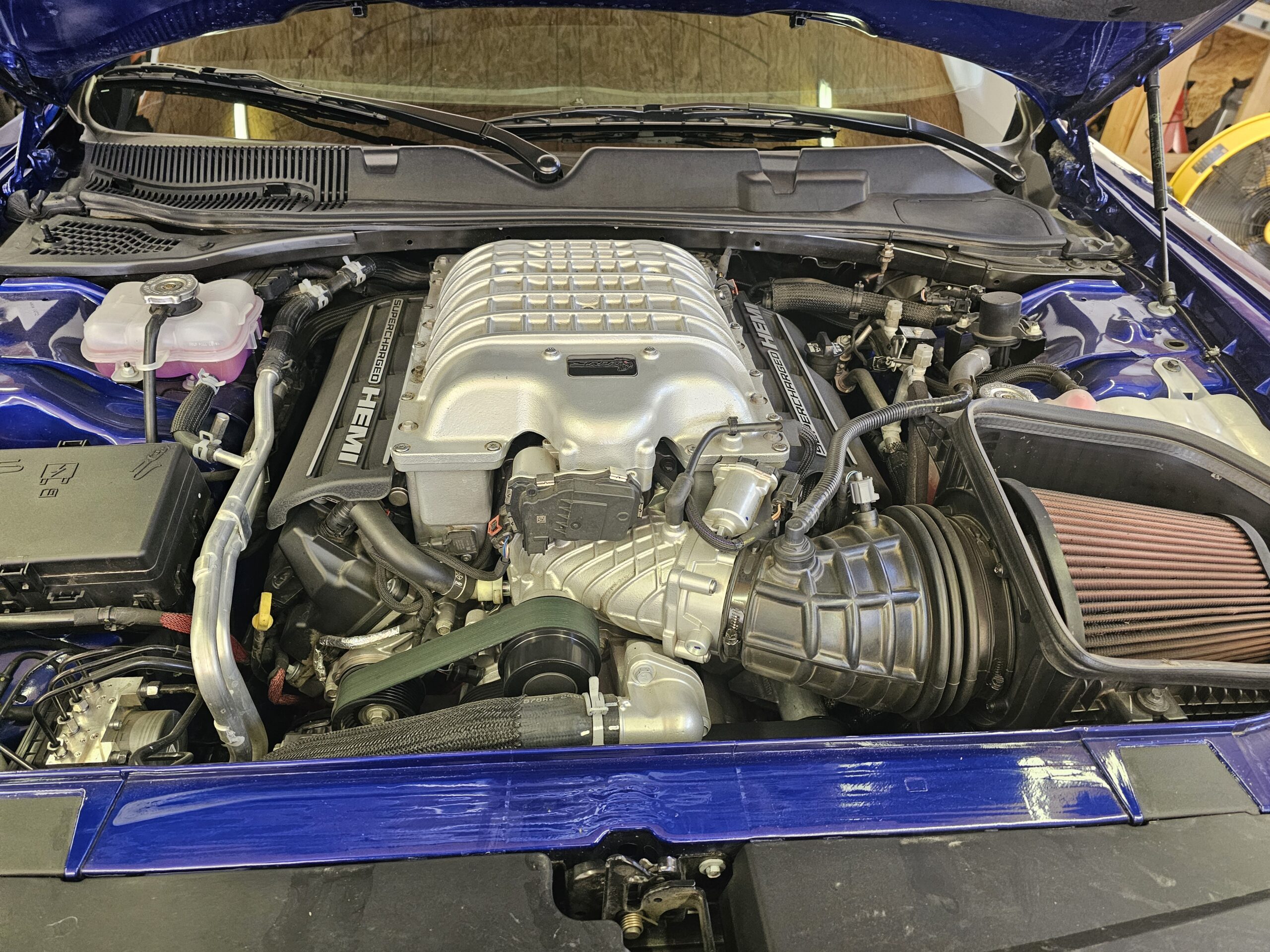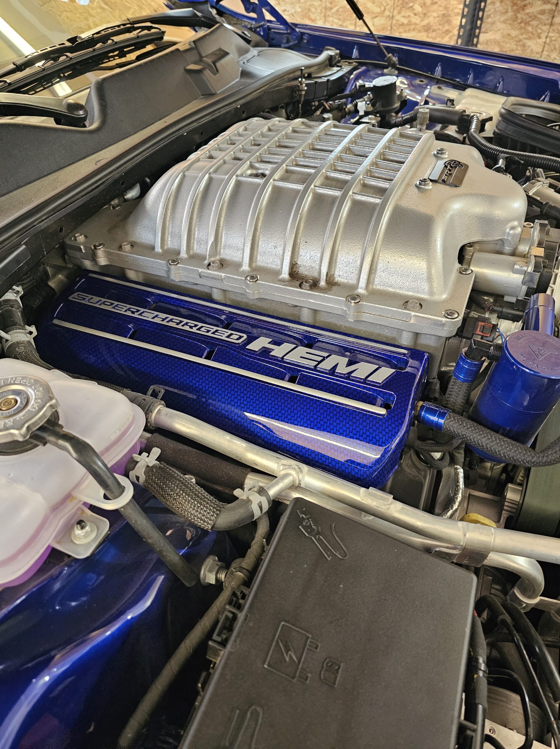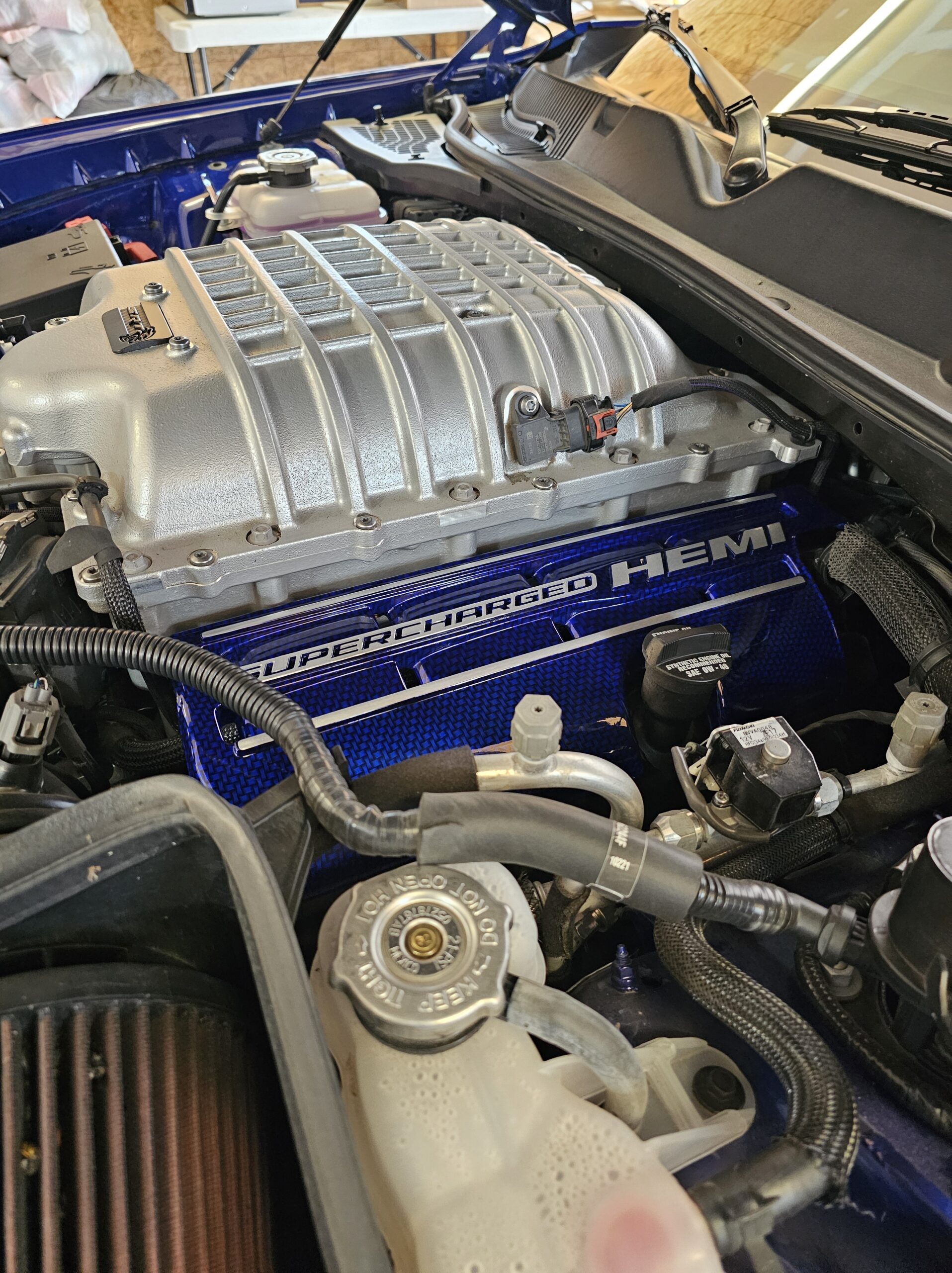 With the “death” of the stock leather bolsters, I worked with Pete at Blue Ribbon Auto, who in turn worked with Katzkin and Dodge to get new interior. Took awhile as Katzkin hadn’t released the Hellcat patterns for the Challenger, only the Charger, until recently. It’s hard to see, but the blue perforation is in the leather holes. It’s a really cool detail that I wasn’t expecting – I was expecting the whole insert to be blue. I much happier with this look; much more subtle. Pete had to go to Dodge for permission to add the Hellcat logo to the headrests.