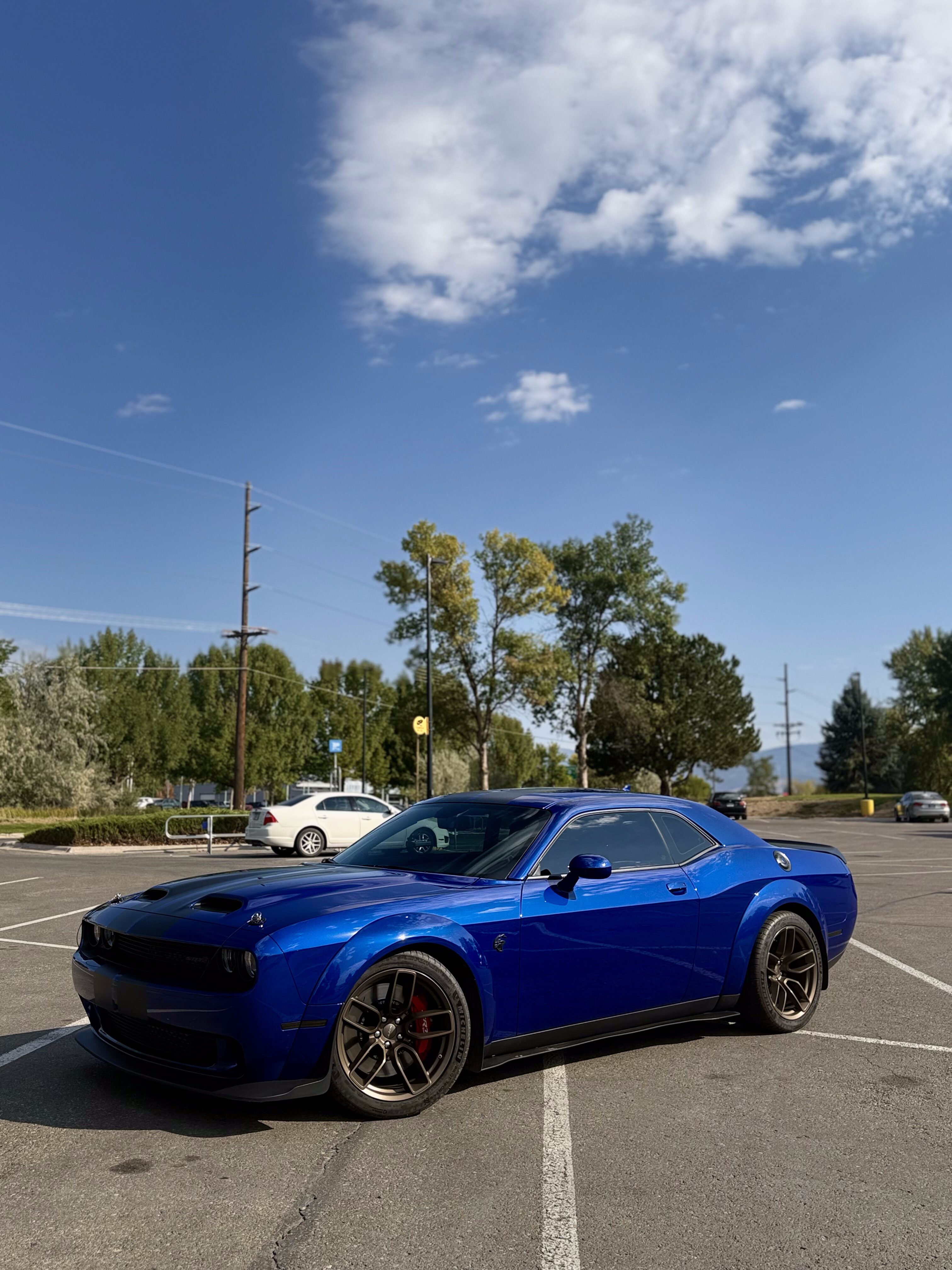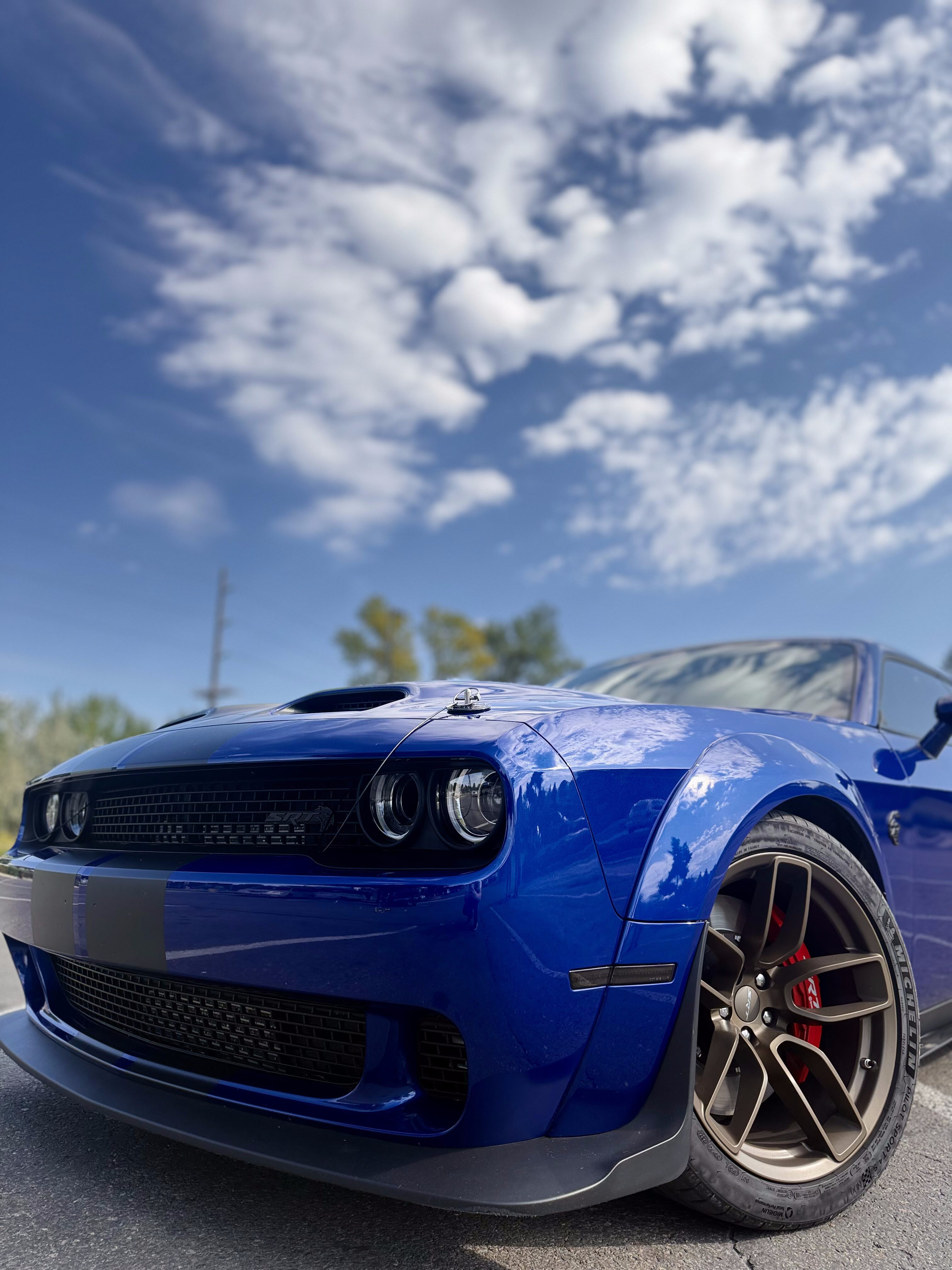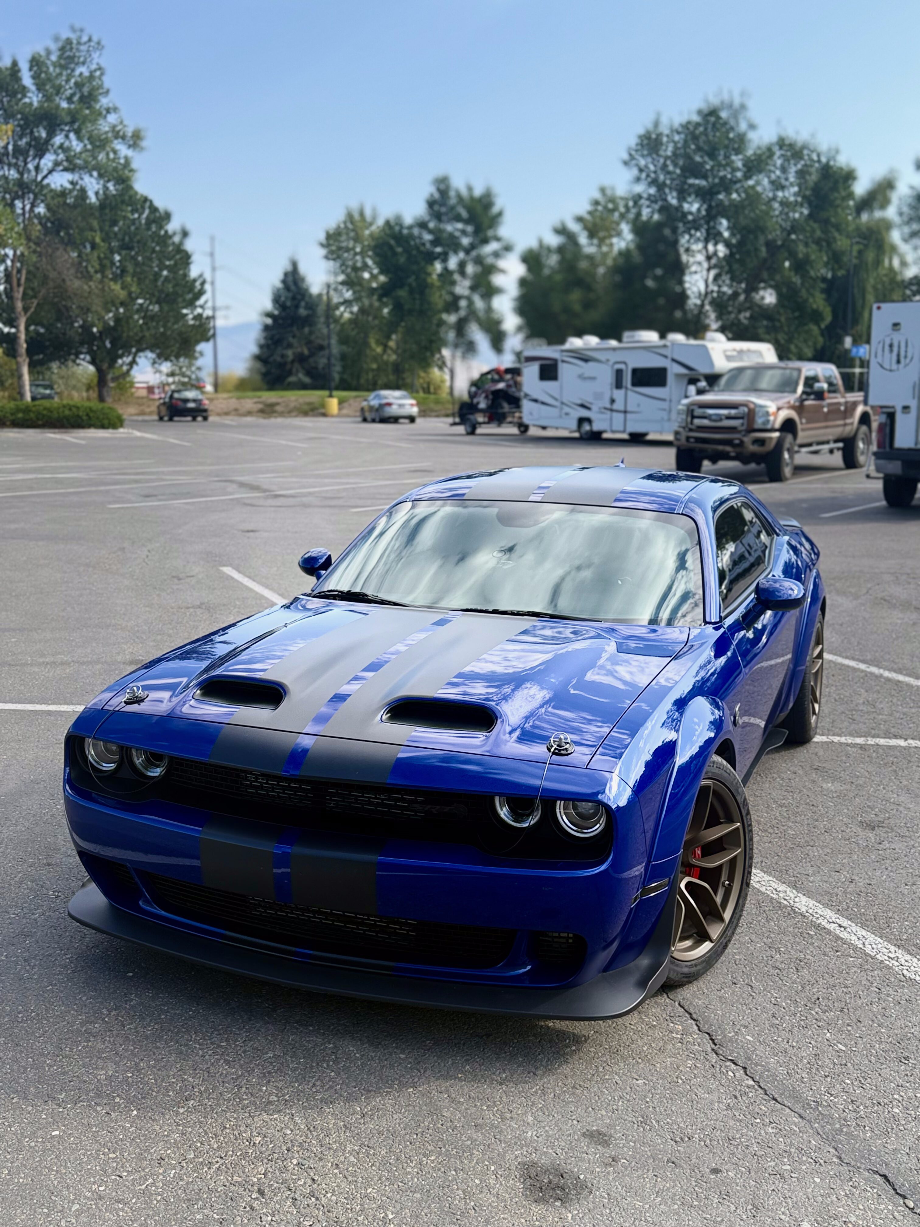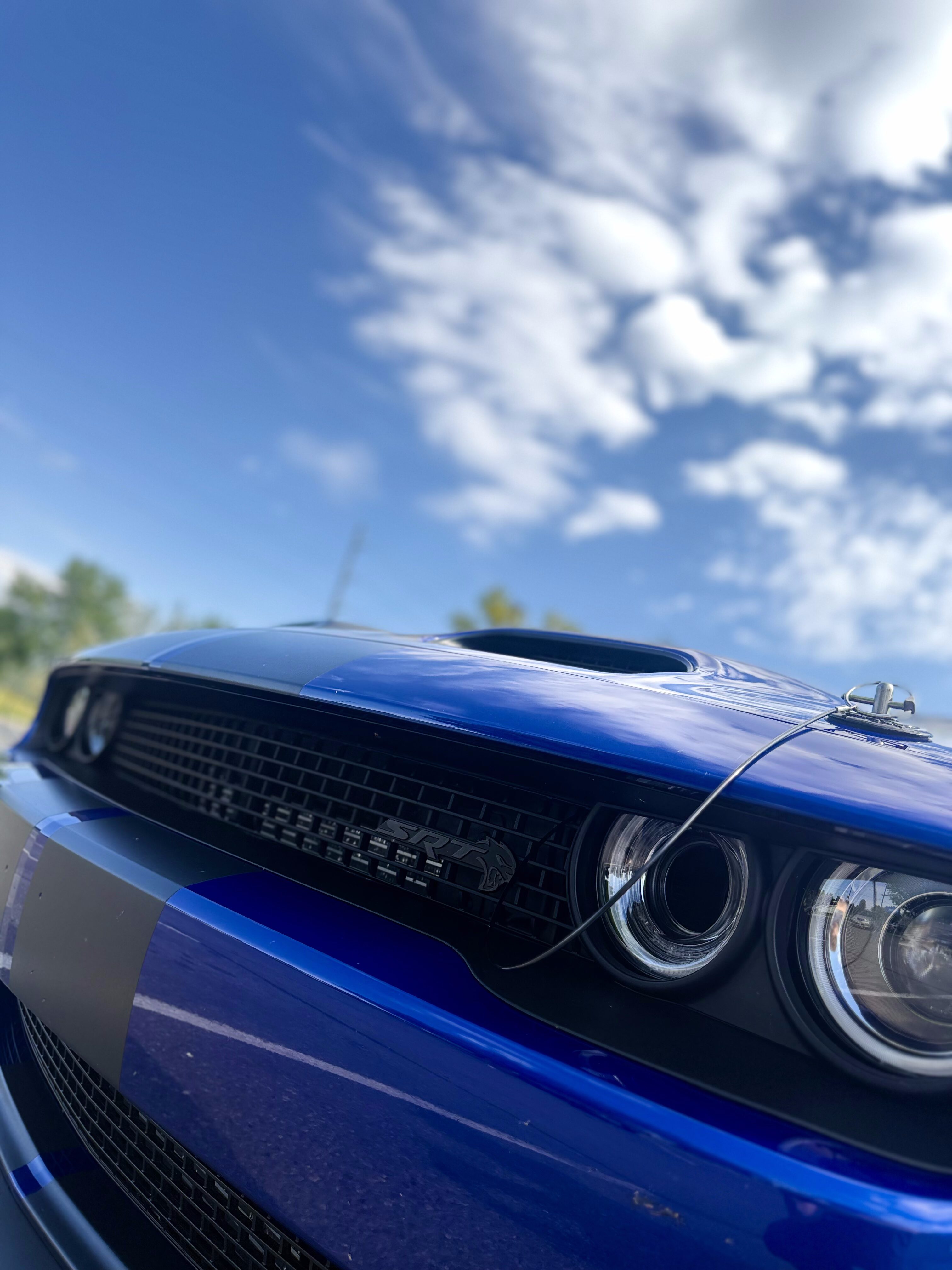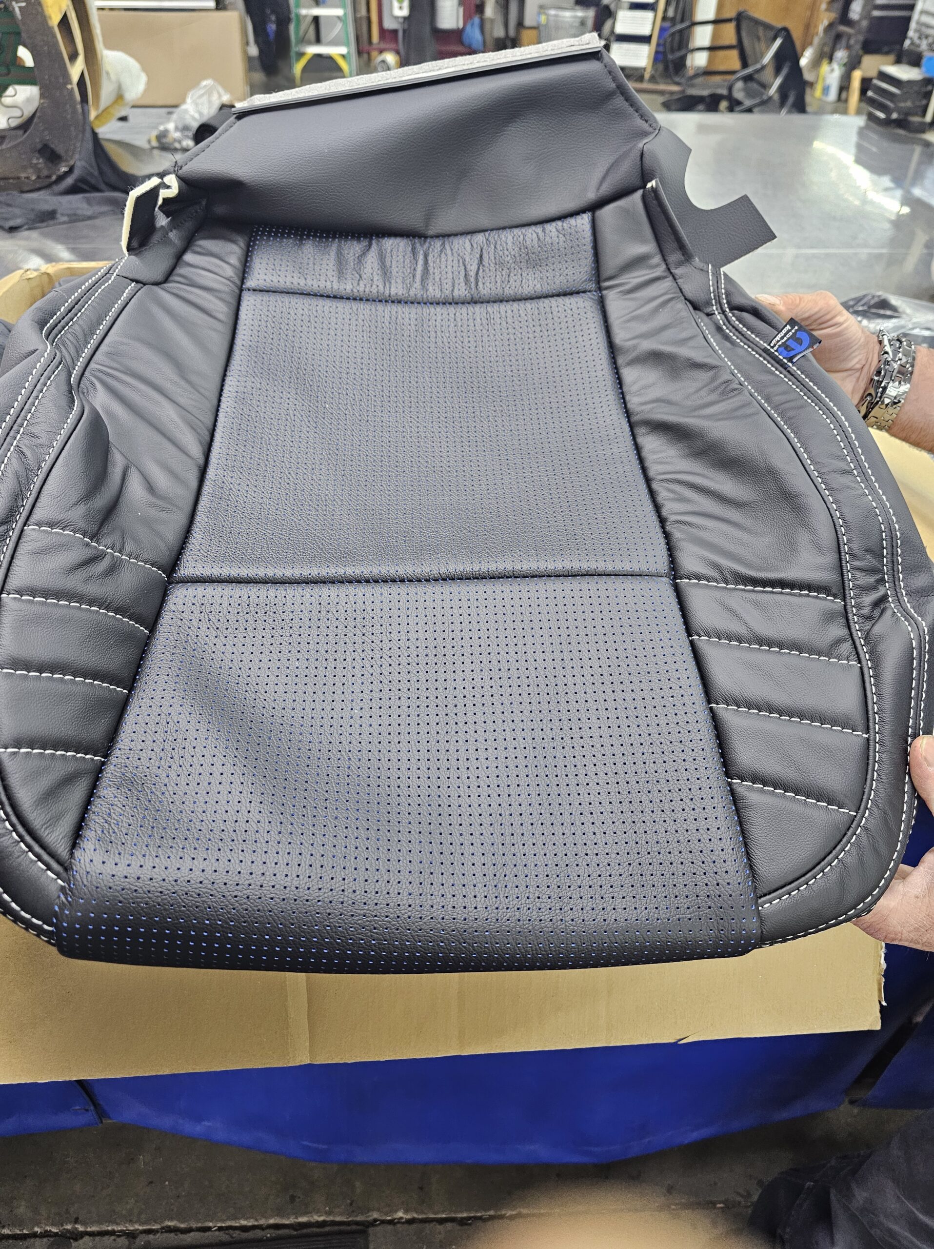 With the “death” of the stock leather bolsters, I worked with Pete at Blue Ribbon Auto, who in turn worked with Katzkin and Dodge to get new interior. Took awhile as Katzkin hadn’t released the Hellcat patterns for the Challenger, only the Charger, until recently. It’s hard to see, but the blue perforation is in the leather holes. It’s a really cool detail that I wasn’t expecting – I was expecting the whole insert to be blue. I much happier with this look; much more subtle. Pete had to go to Dodge for permission to add the Hellcat logo to the headrests.