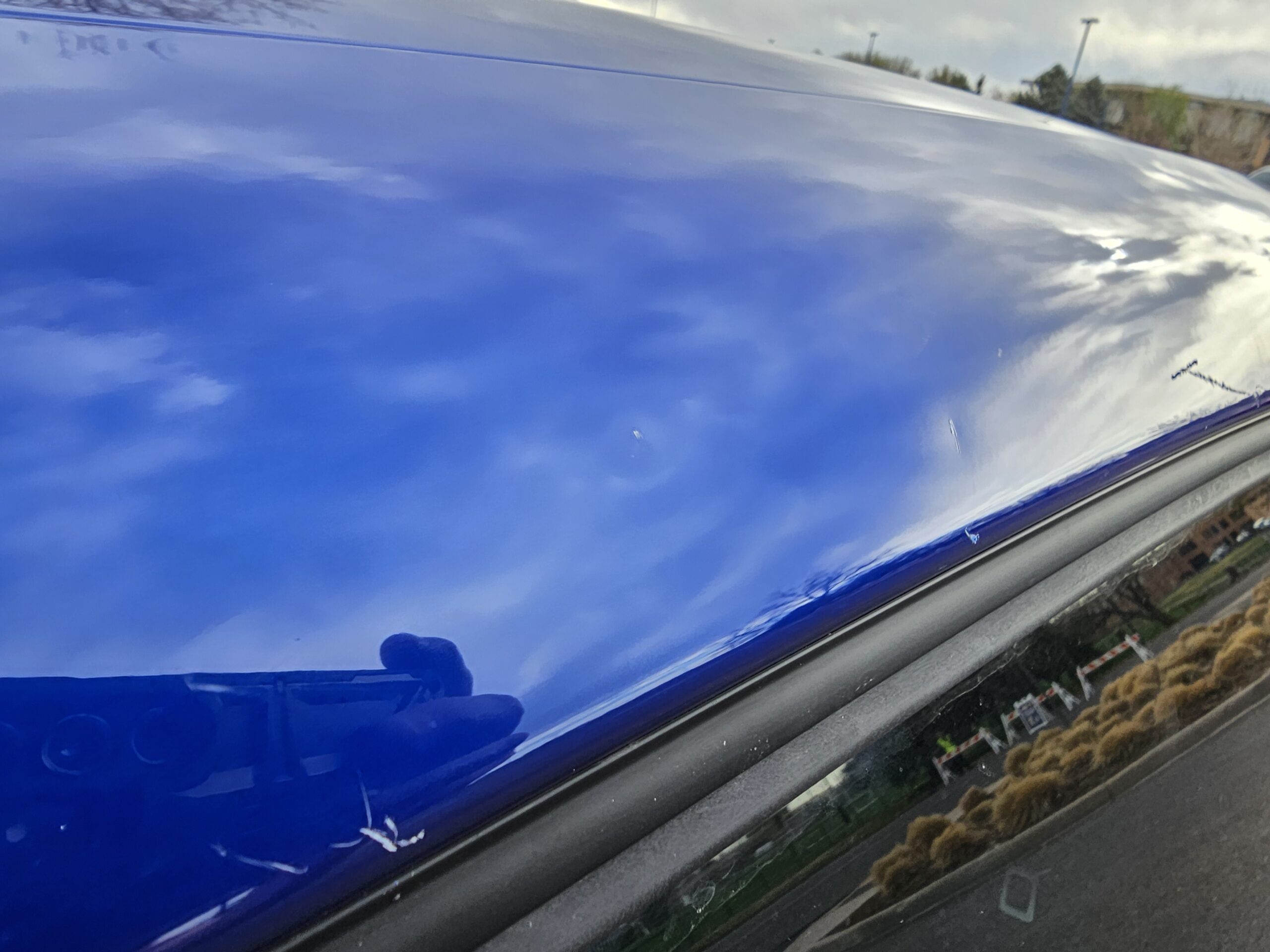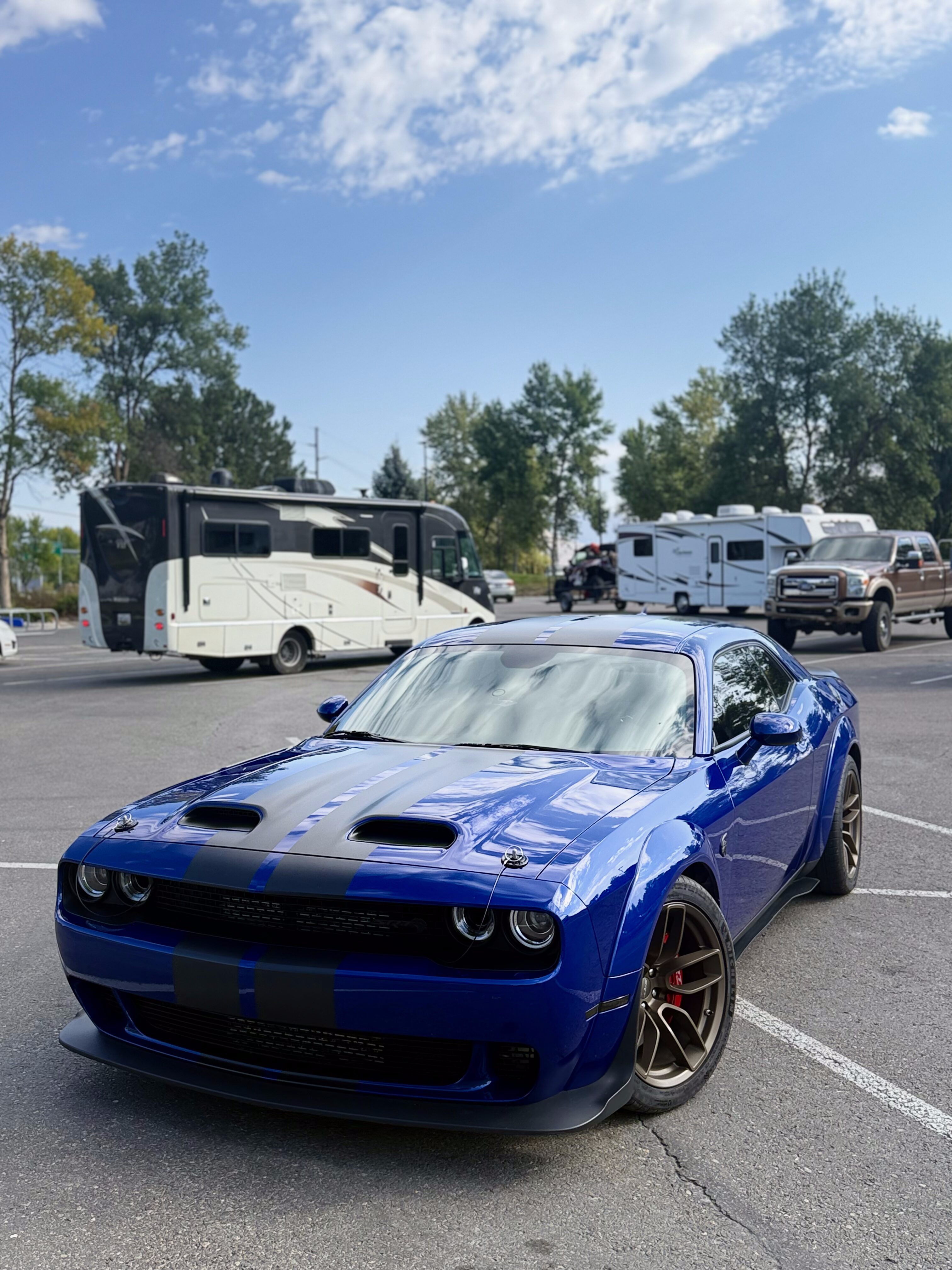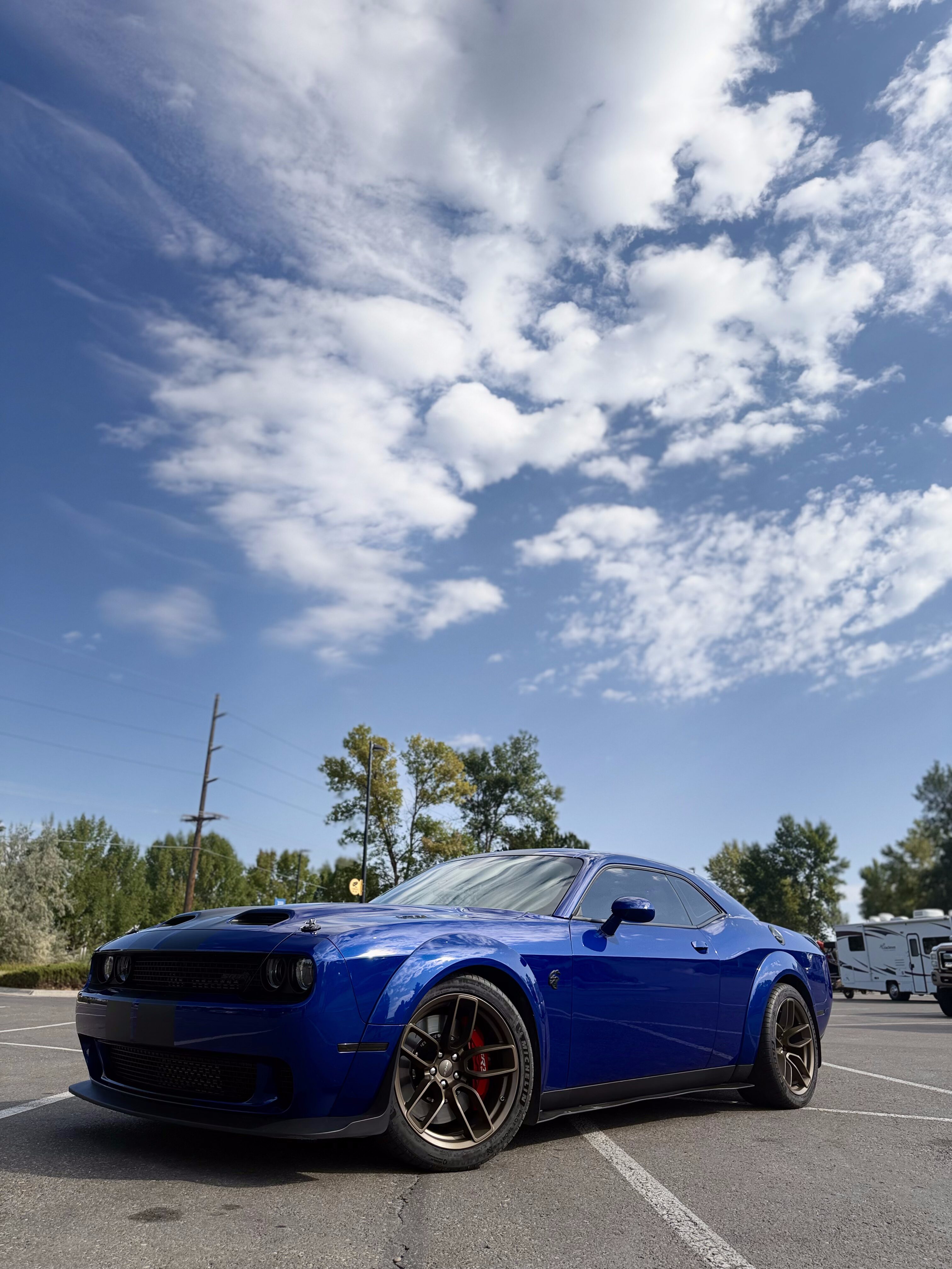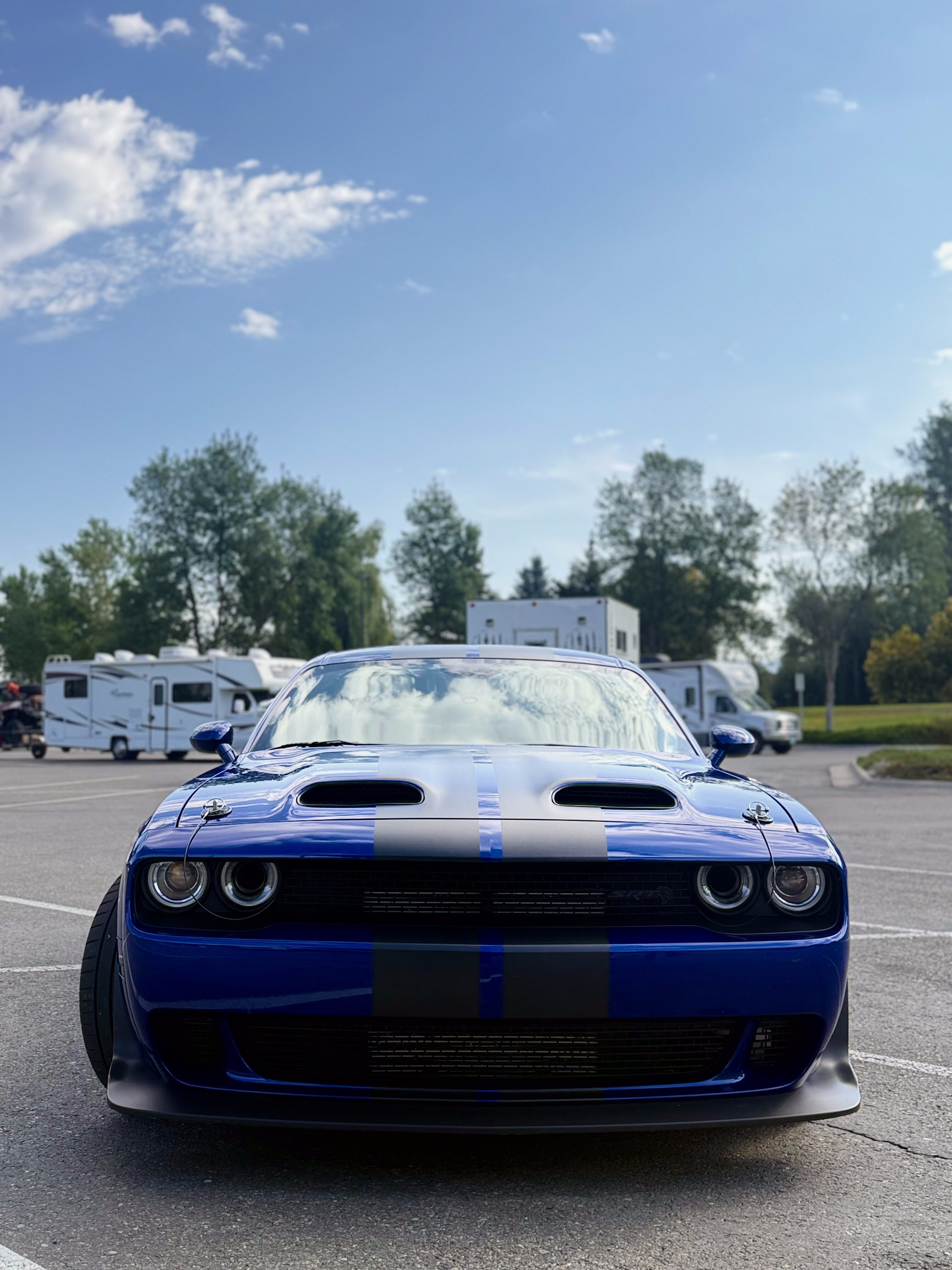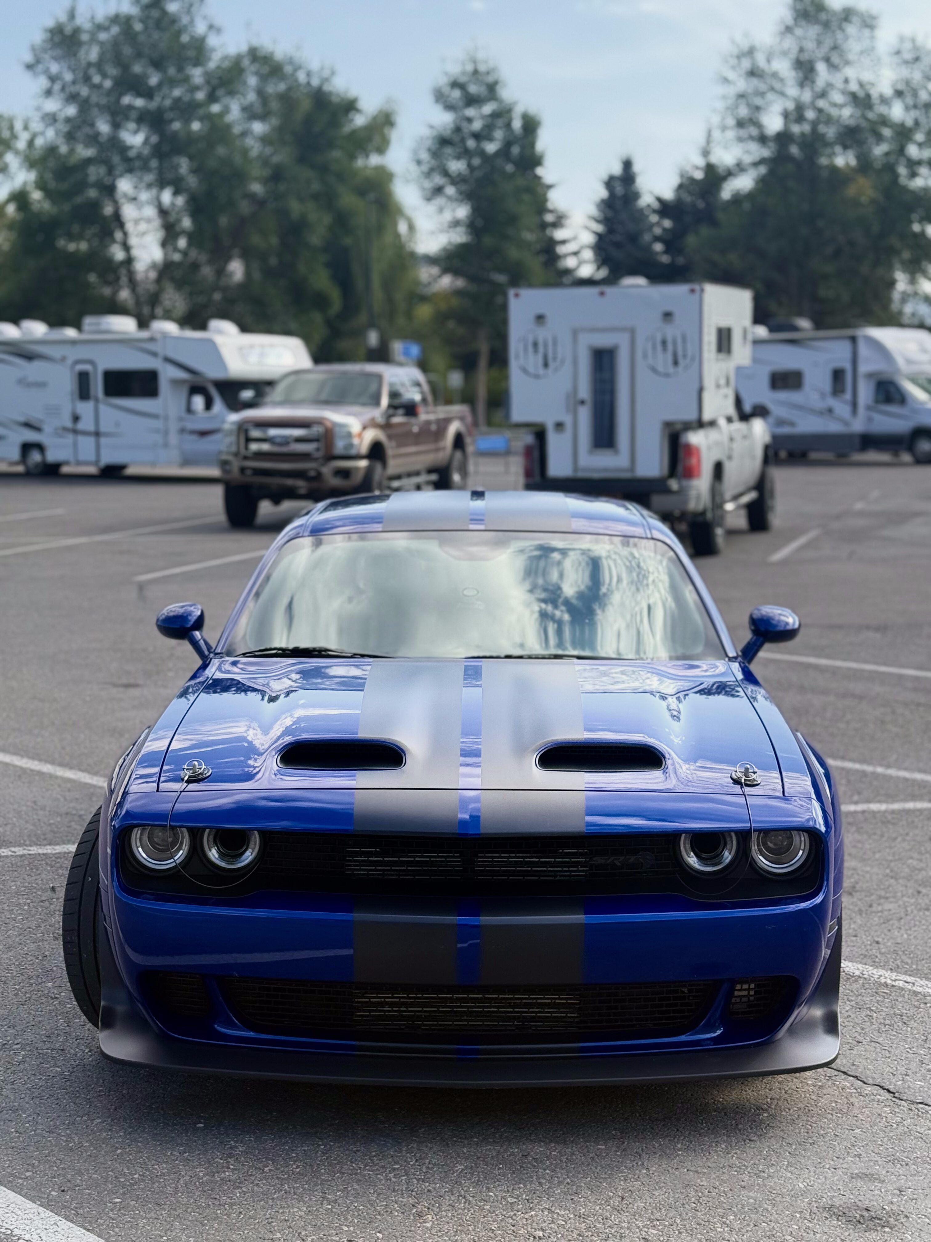 With the “death” of the stock leather bolsters, I worked with Pete at Blue Ribbon Auto, who in turn worked with Katzkin and Dodge to get new interior. Took awhile as Katzkin hadn’t released the Hellcat patterns for the Challenger, only the Charger, until recently. It’s hard to see, but the blue perforation is in the leather holes. It’s a really cool detail that I wasn’t expecting – I was expecting the whole insert to be blue. I much happier with this look; much more subtle. Pete had to go to Dodge for permission to add the Hellcat logo to the headrests.
